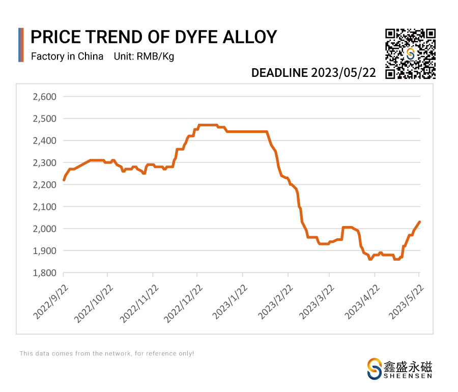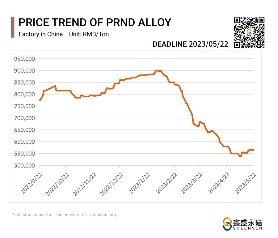 On May 22, 2023, Sheensen Magnetics will share the price trend information of rare earth raw materials for your reference when purchase rare earth permanent magnet materials and magnet assembly.