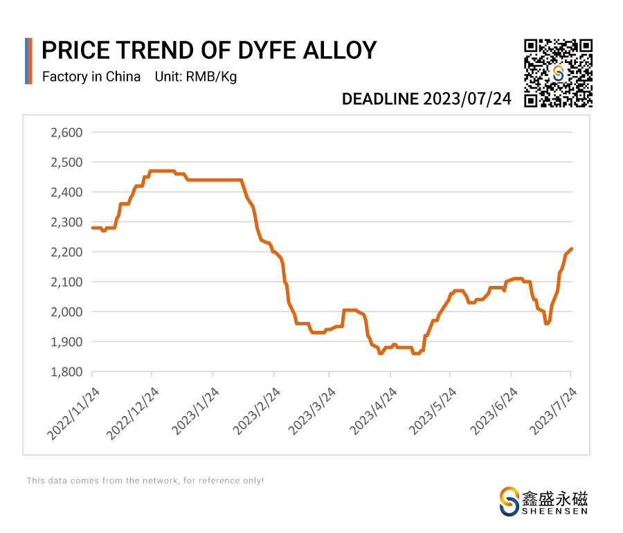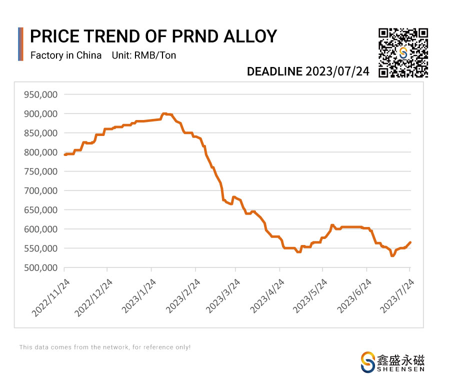 On July 24, 2023, Sheensen Magnetics will share the price trend information of rare earth raw materials for your reference when purchase rare earth permanent magnet materials and magnet assembly.