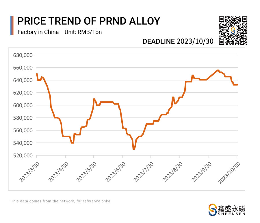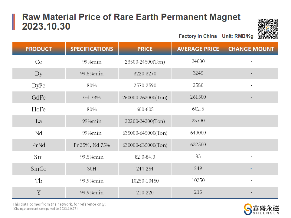 On October 30, 2023, Sheensen Magnetics will share the price trend information of rare earth raw materials for your reference when purchase rare earth permanent magnet materials and magnet assembly.