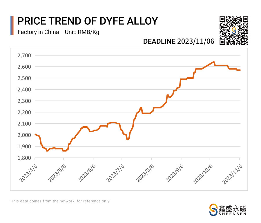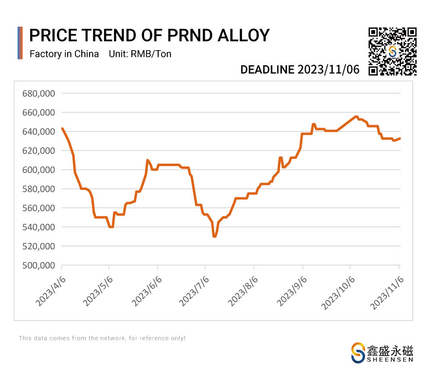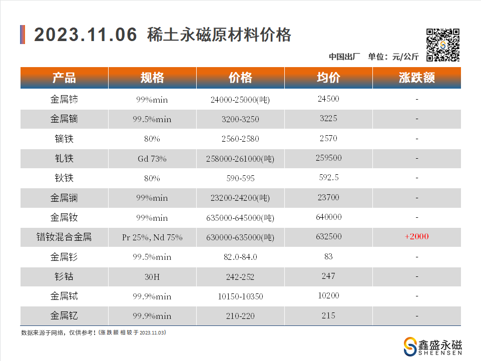 On November 06, 2023, Sheensen Magnetics will share the price trend information of rare earth raw materials for your reference when purchase rare earth permanent magnet materials and magnet assembly.