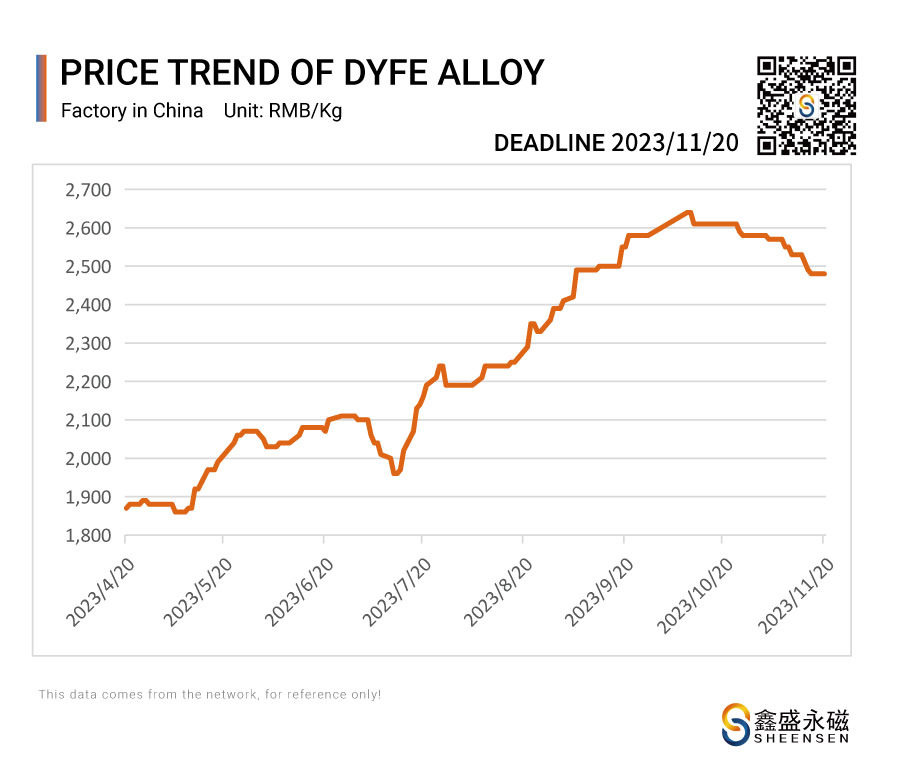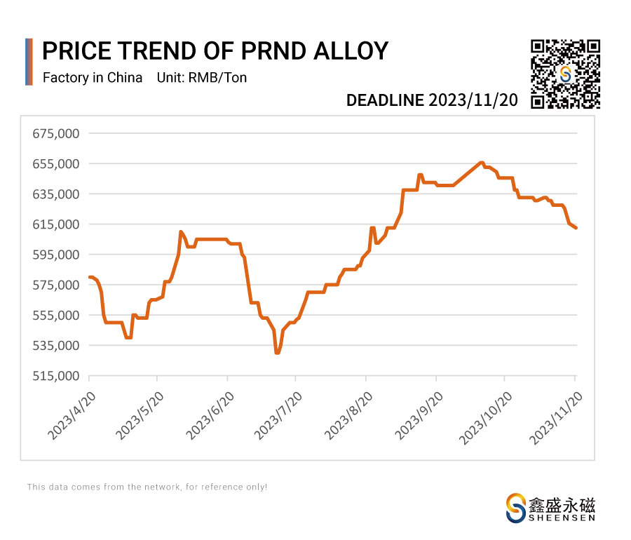 On November 20, 2023, Sheensen Magnetics will share the price trend information of rare earth raw materials for your reference when purchase rare earth permanent magnet materials and magnet assembly.