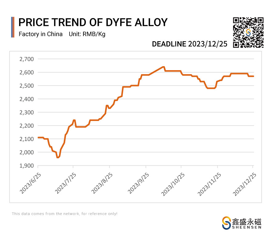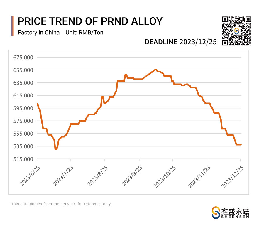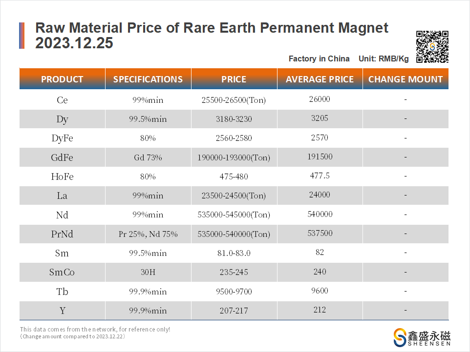 On December 25, 2023, Sheensen Magnetics will share the price trend information of rare earth raw materials for your reference when purchase rare earth permanent magnet materials and magnet assembly.