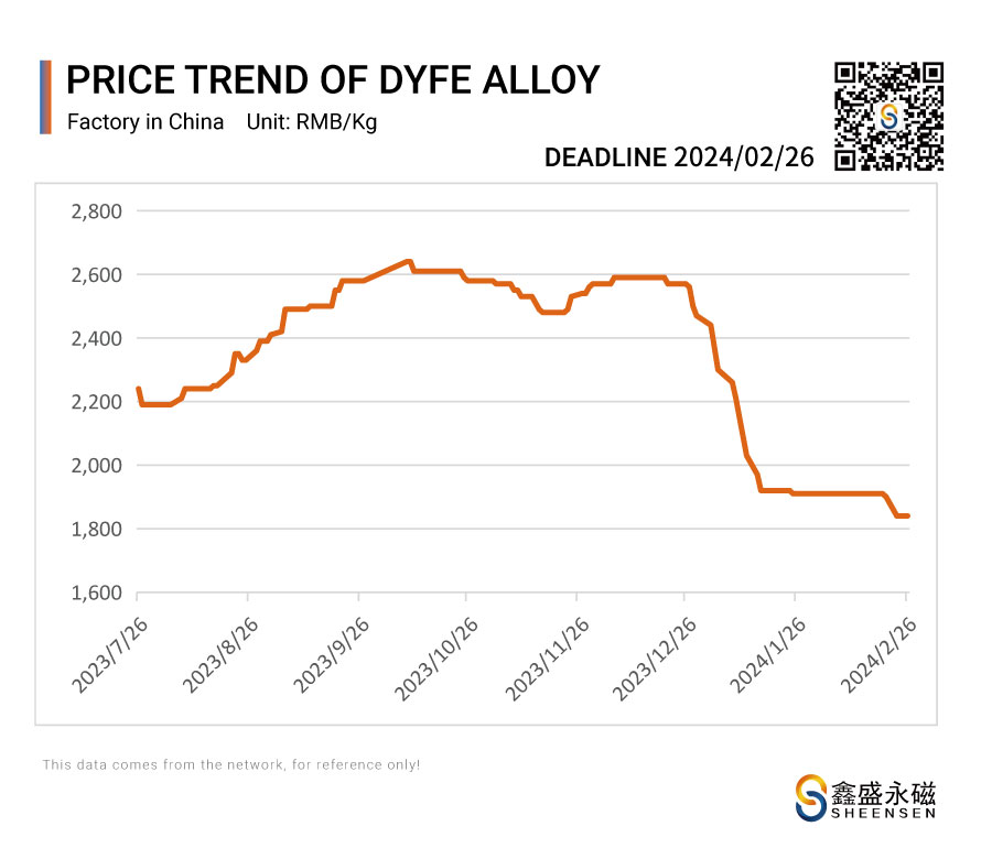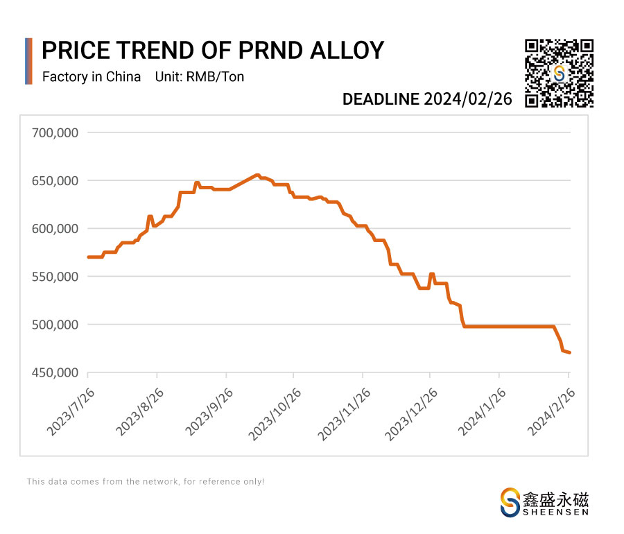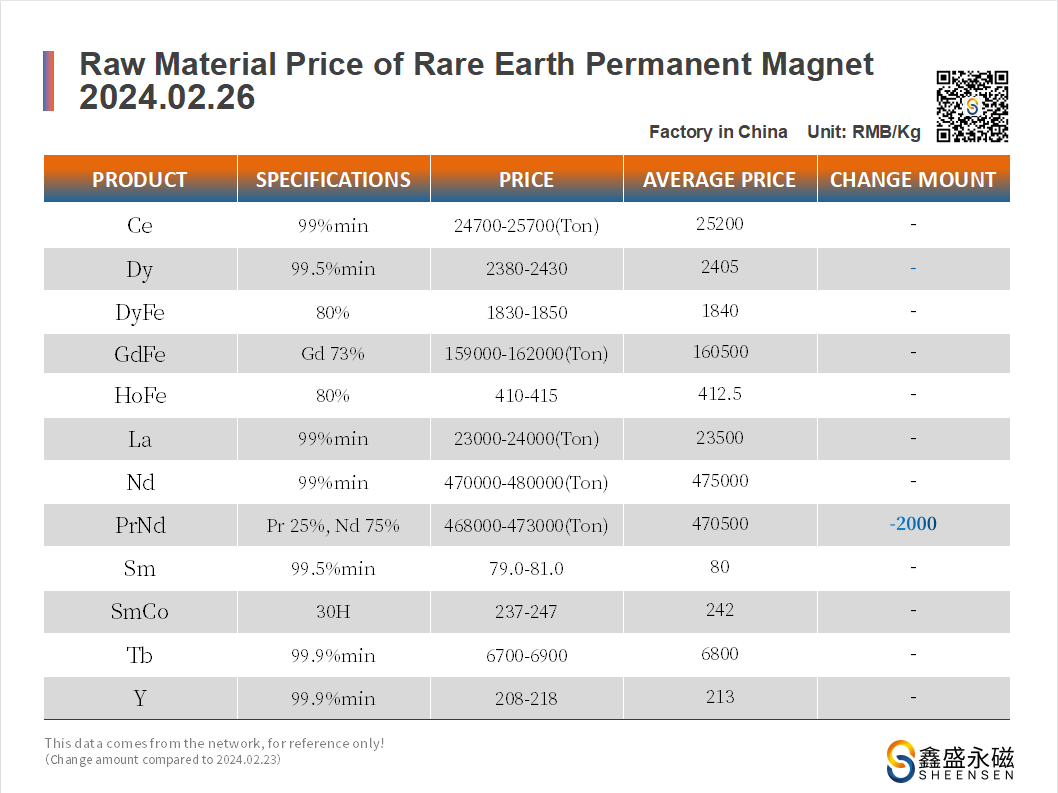On February 26, 2024, Sheensen Magnetics will share the price trend information of rare earth raw materials for your reference when purchase rare earth permanent magnet materials and magnet assembly.
