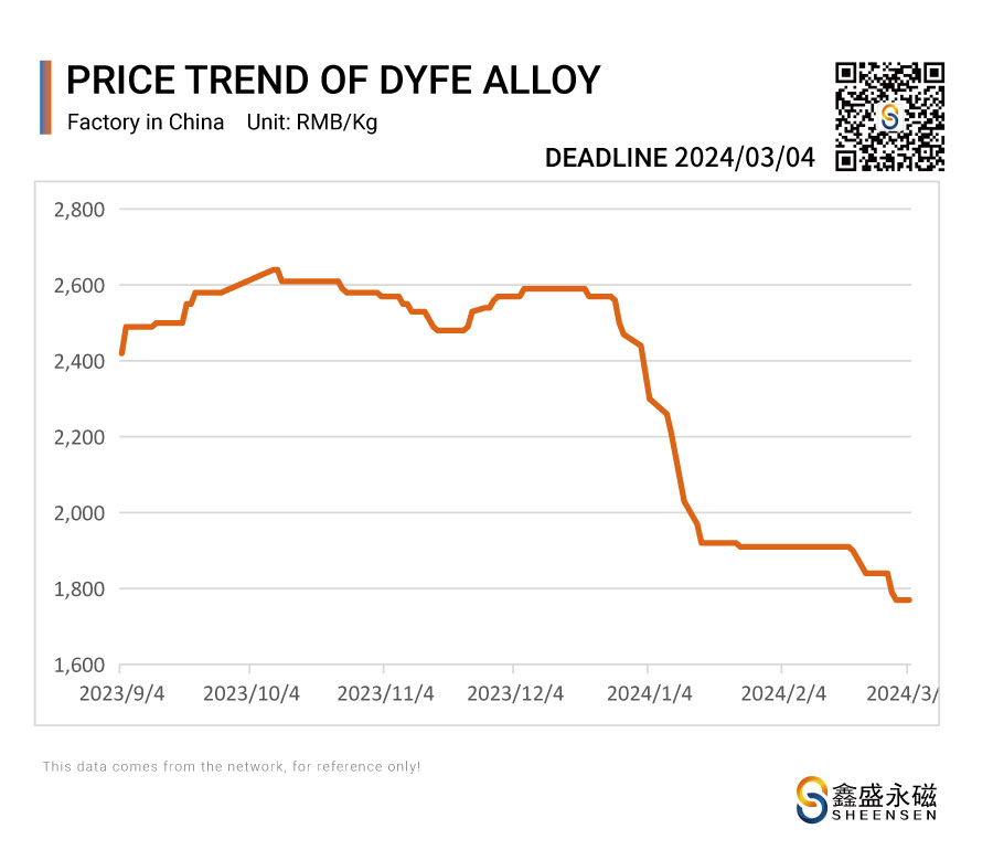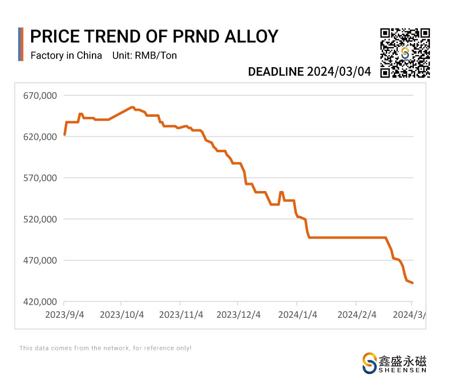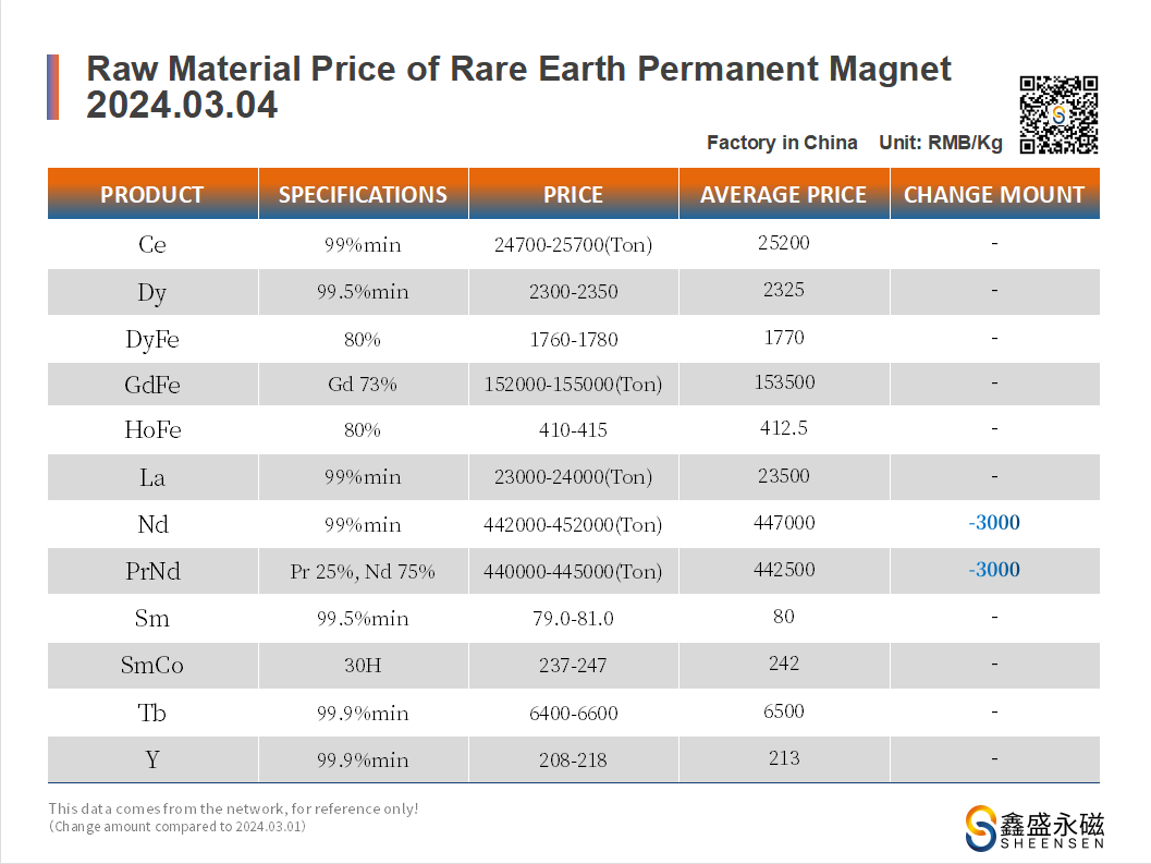 On March 04, 2024, Sheensen Magnetics will share the price trend information of rare earth raw materials for your reference when purchase rare earth permanent magnet materials and magnet assembly.