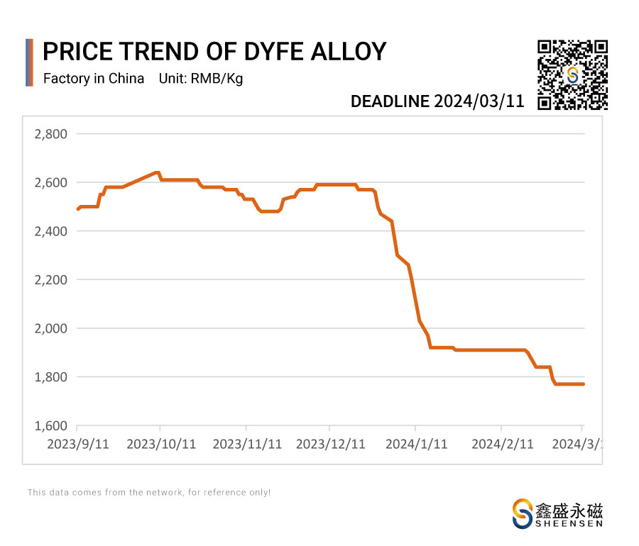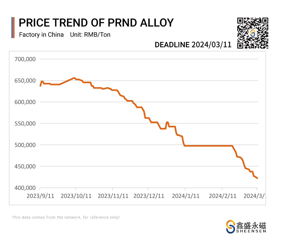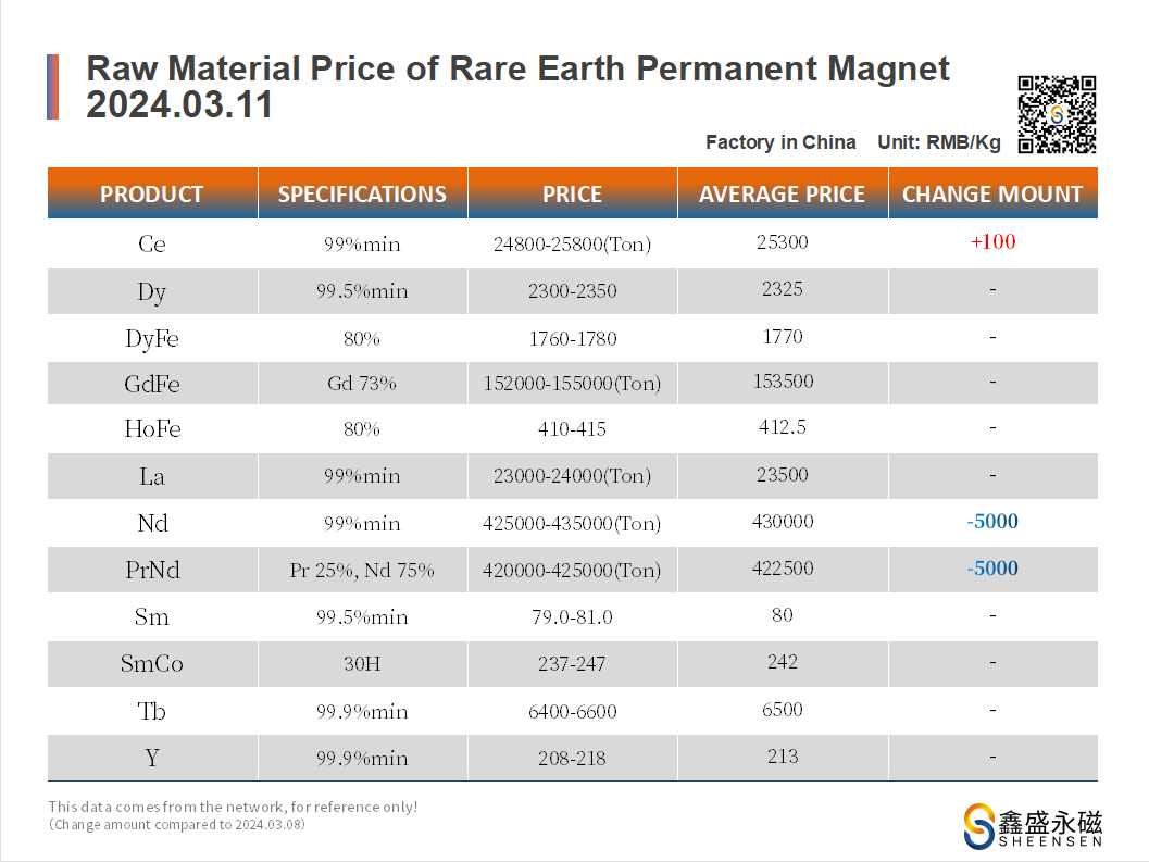 On March 11, 2024, Sheensen Magnetics will share the price trend information of rare earth raw materials for your reference when purchase rare earth permanent magnet materials and magnet assembly.