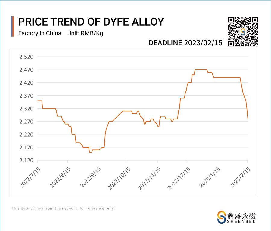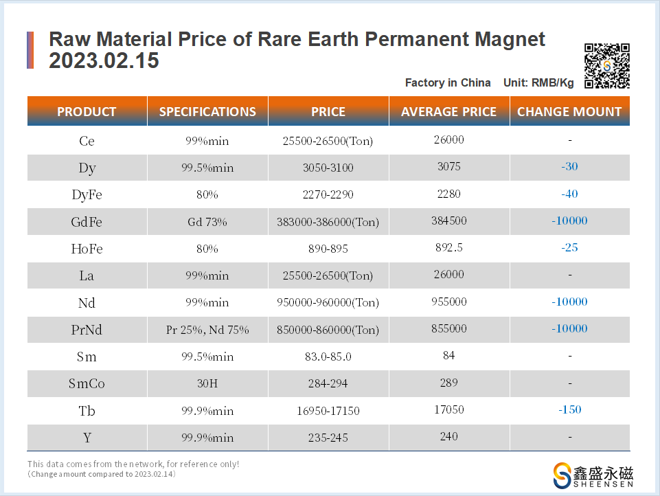 On February 15, 2023, Sheensen Magnetics will share the price trend information of rare earth raw materials for your reference when purchase rare earth permanent magnet materials and magnet assembly.