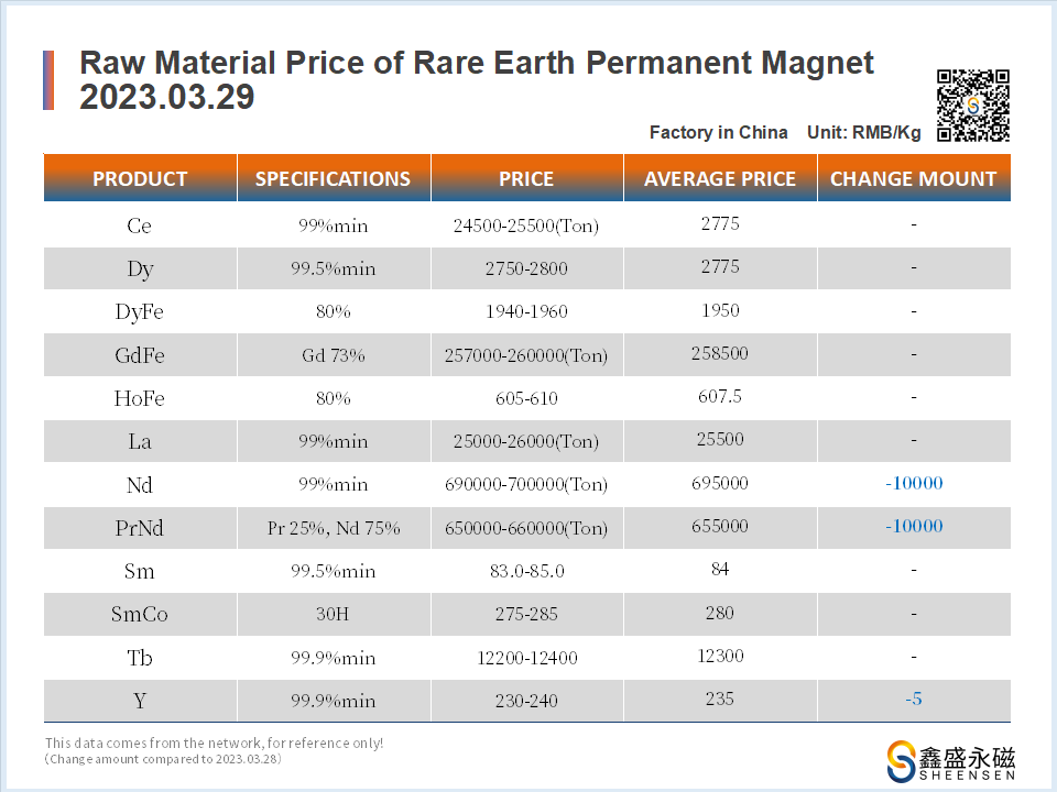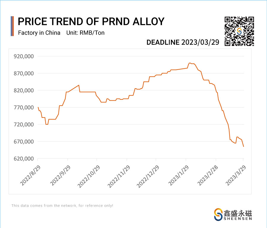 On March 29, 2023, Sheensen Magnetics will share the price trend information of rare earth raw materials for your reference when purchase rare earth permanent magnet materials and magnet assembly.
